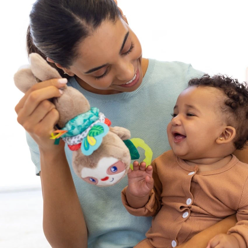 Je hangt de luiaard gemakkelijk op aan de achterpootjes. De vrolijke kleurtjes dragen bij aan de visuele ontwikkeling van jouw kleintje. Het is niet erg als je kleintje hapt naar het trekkoord want deze dient tevens als bijtring. Zo kan je kindje onbezorgd spelen met het leuke beestje!Â