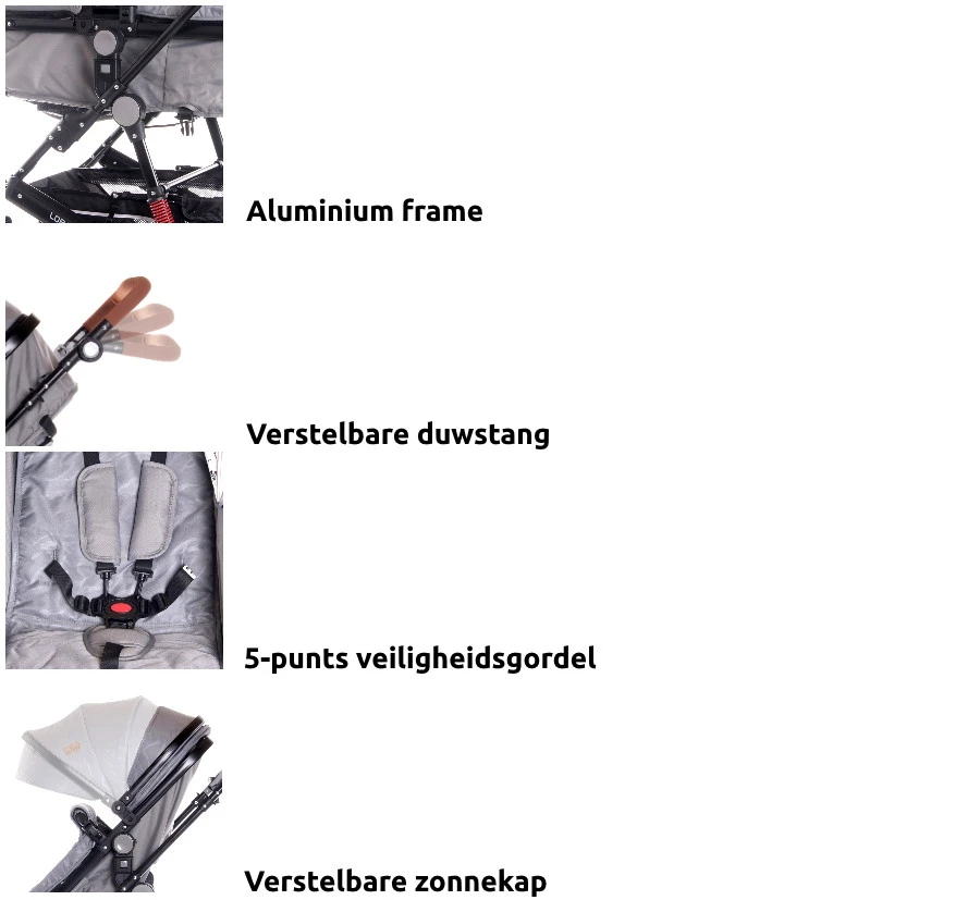 De Lora heeft zwenkwielen aan de voorkant en shock absorbers, hierdoor is de wagen wendbaar op ieder terrein. De in hoogte verstelbare duwstang zorgt ervoor dat jij altijd comfortabel achter de wagen kan lopen. Wil je onderweg wat boodschappen doen? Geen probleem om ze mee te nemen in de grote boodschappenmand!